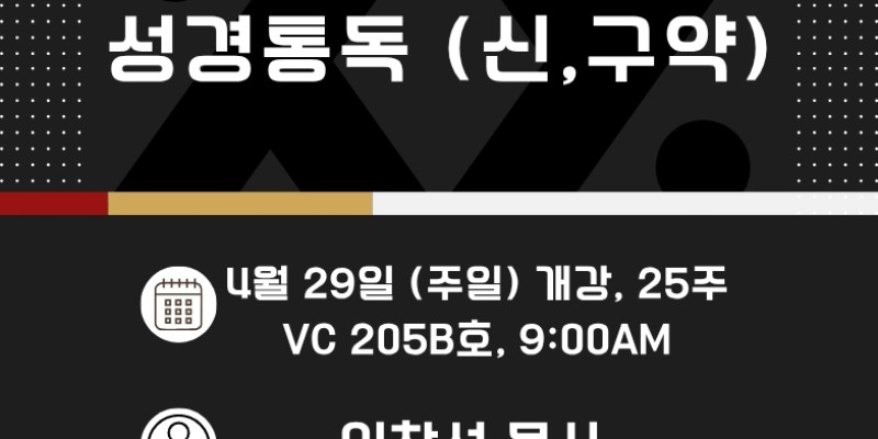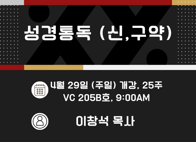 개강 : 4/29(주일) 9AM VC 205B, 25주 과정