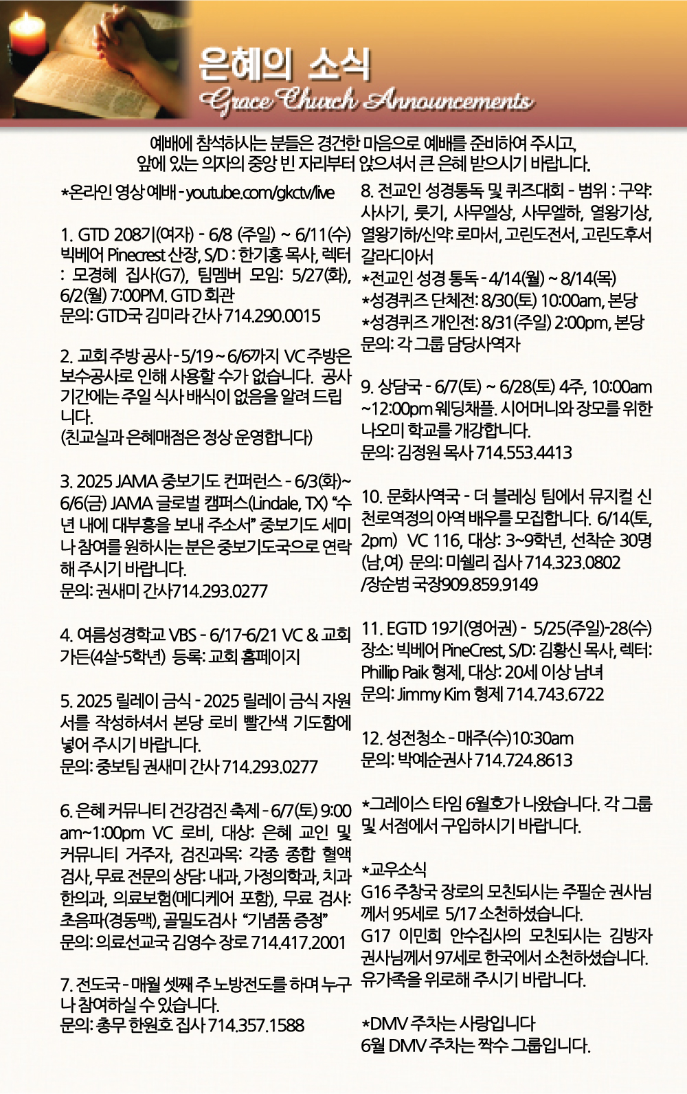 작성자 : 은혜한인교회 작성일 : 2025-05-25 조회수 : 1,682