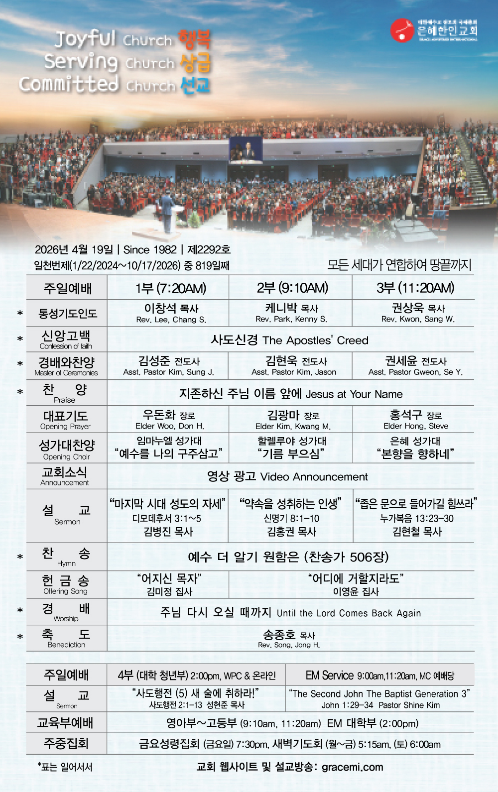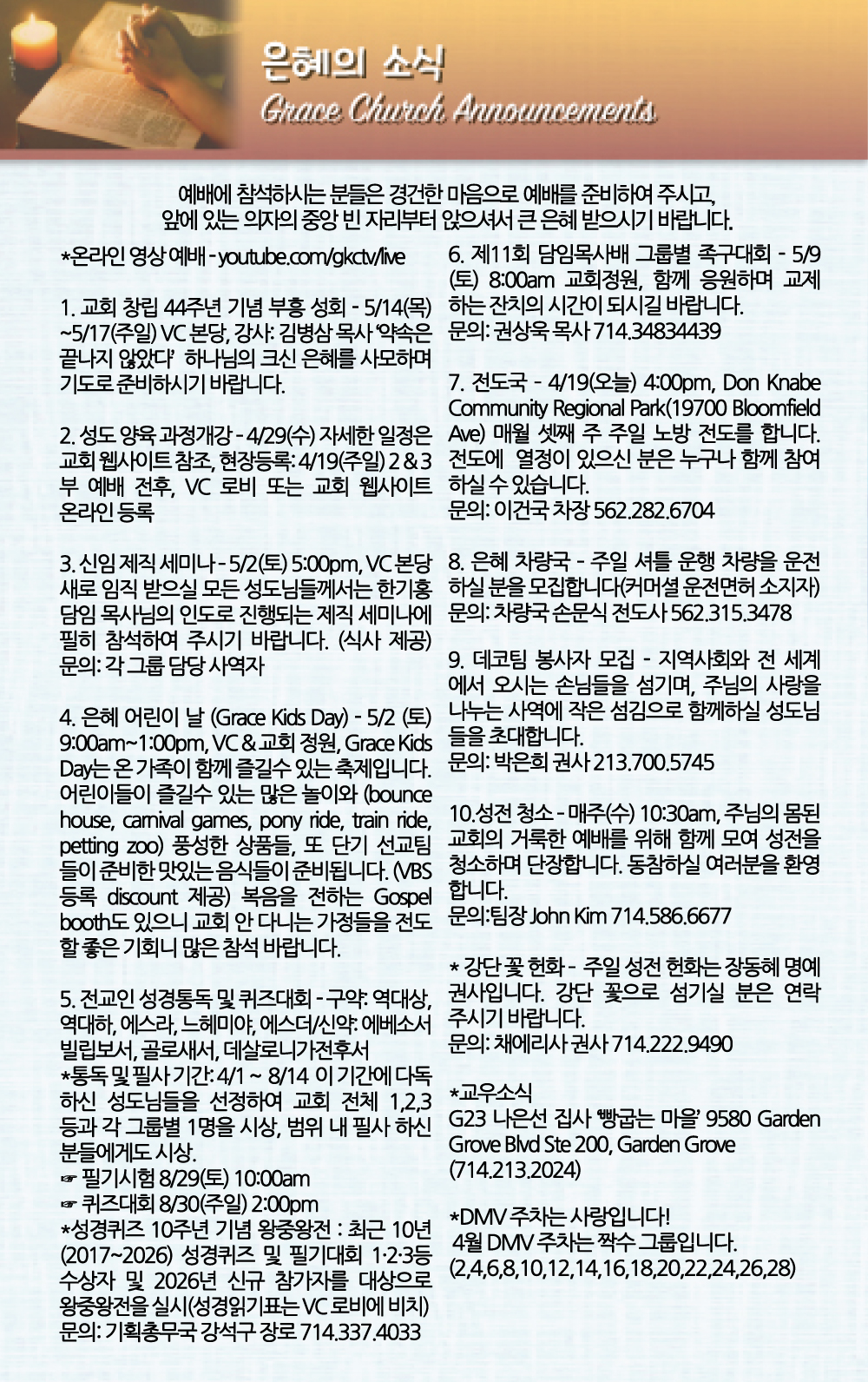 작성자 : 은혜한인교회 작성일 : 2026-04-19 조회수 : 583