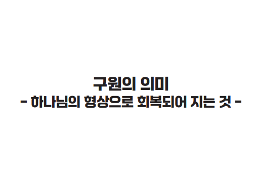 구원에 대하여 “예수님을 믿고 죽은 후 천국에 가는 것”이라고 흔히 답한다. 그런데 구원은 사후의 삶뿐만이 아니다. 구원은 “이미” “아직”의 성격을 지니고 있어 아직 구원이 완성되지 않았기에 이런 점에서 구원은 현재진행형이다. 성경적으로 볼 때 구원은 단순히 죄에서 벗어나는 것을 넘어서 하나님과 단절된 상태에서 하나님과의 관계를 회복하는 것을 말한다. 여기에는 새로운 피조물로 변화되어 하나님의 뜻에 따라 살아가는 삶까지 포함되는 것이다. 다시 말해 하나님이 사람을 자신의 형상대로 지으셨고 그 형상이 죄로 인해 훼손되었기에 구원은 결국 하나님의 형상으로 회복되어지는 것을 말하는 것이다.