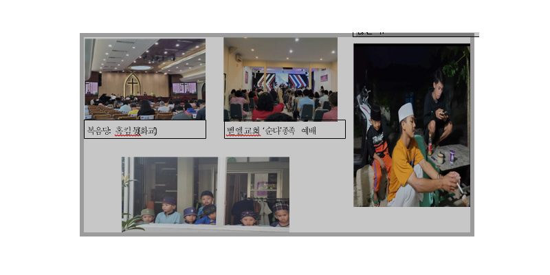 동네 금요 어린이 성경공부방: 한인 교회에서 봉사활동을 하고 있는 인도네시아 자매가 선교사님들과 함께 동네에 거처를 마련하고 변두리 지역 아이들을 모아다가 매주 금요일 성경공부방을 열고 있다. 비록 크고 작은 핍박이 있지만 하나님의 도우심으로 잘 진행되고 있다. 무슬림 어린이 집 아이들이 더욱 마음에 걸리는 부분이다.