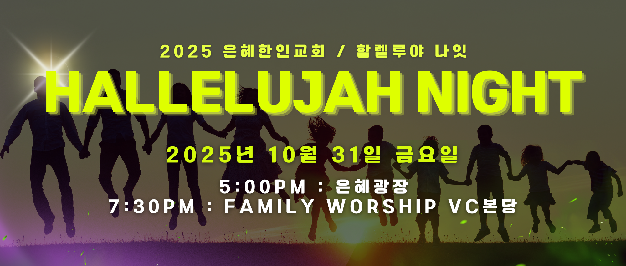 “10월 31일 금요일 오후 5시! 교육부 주최 할렐루야 나잇 & 패밀리 워십이 열립니다.온 가족이 함께 찬양하고, 말씀과 즐거운 프로그램으로 하나님께 영광 돌리는 특별한 시간!아이들부터 어른까지 모두가 함께 웃고, 함께 예배하는 자리로 여러분을 초대합니다.10월 31일 오후 5시, 꼭 오셔서 은혜와 기쁨을 누리세요.할렐루야 나잇 & 패밀리 워십! 여러분을 기다립니다!”