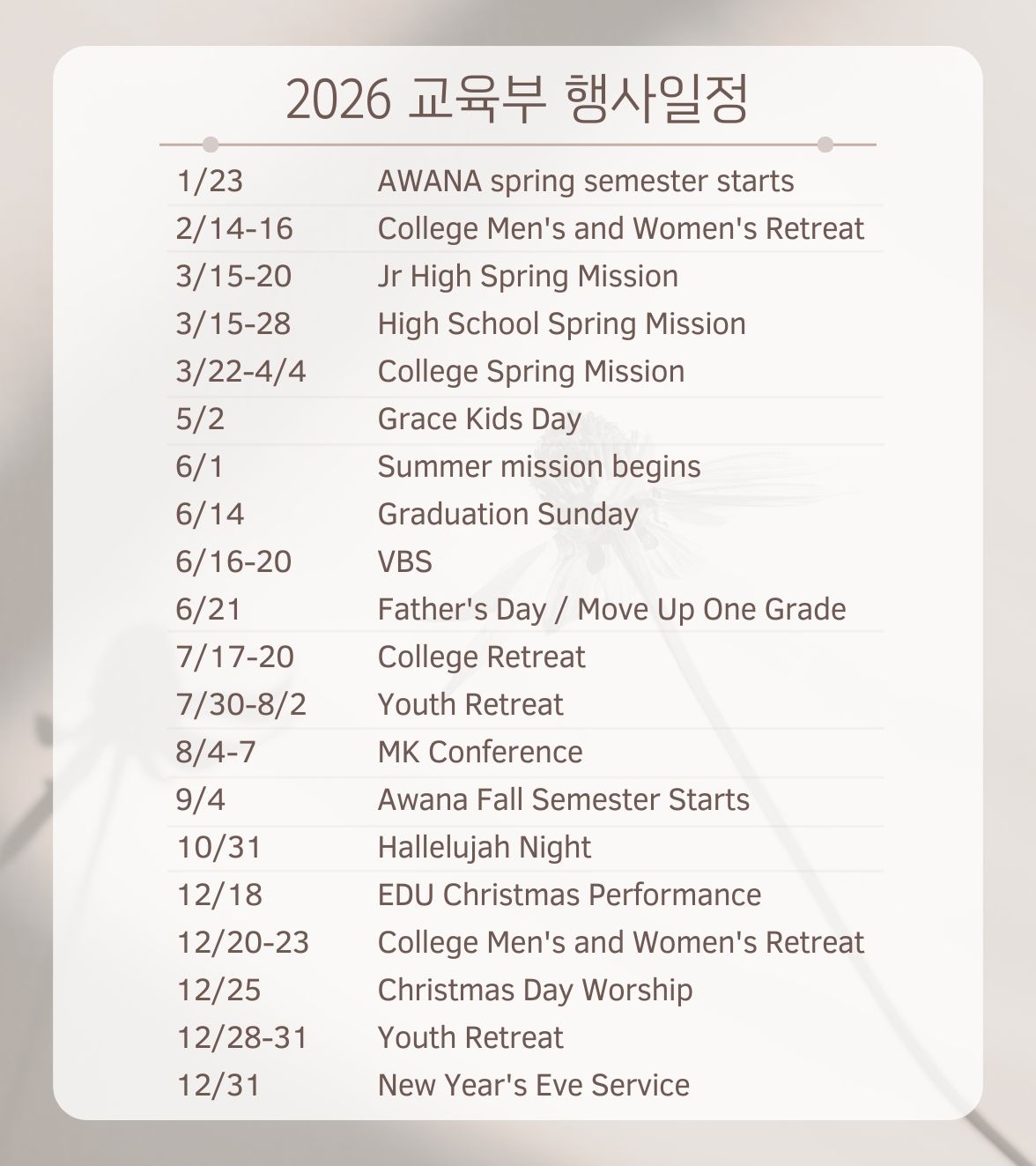EDUCATION PLAN교육부 사역계획 2026 교육부 행사 일정 페이지 정보 WRITER : 은혜한인교회 DATE : 2026-01-15 목록 본문 2026년 교육부 행사 일정 다음글교육부 겨울 수련회 25.11.24 LIST 댓글 0 댓글목록 등록된 댓글이 없습니다.
