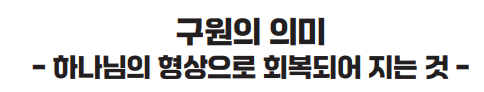 이 땅에 사는 모든 인생은 에덴동산으로부터 영원한 사망으로 쫓겨난 죄인들이다. 그래서 하나님이 이 죄인들을 살리려고 예수라는 이름으로 육신이 되셔서 속죄 제물로 십자가에서 희생을 당하신 것이다. 우리가 죄를 사함 받고 영원한 생명으로 나아갈 수 있도록 십자가에서 피 흘려주신 것이다. 이를 믿는 자마다 훼손된 하나님의 형상이 회복되어져 하나님이 창조하셨던 원래의 온전한 인격체로 돌아갈 수 있게 된 것이다. 이렇게 완전한 영혼, 완전한 육체로 회복되어 하나님의 성품을 순종의 삶을 통하여 반사하는 것이 진정한 구원이다.