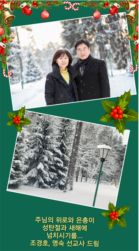 코로나와 함께 2021년 마지막 시간을 보내면서 깨달아야 하는 것이 무엇인지 살아계신 하나님께 질문해 봅니다. 원칙이 깨지는 황당함에...그럴수도 있음을 배웁니다. 수고가 무시되는 허탈함에...하나님 한분으로 만족함을 훈련받습니다. 위기 속 수많은 정보들의 불안속에... 말씀안에서 안심하는 여유로움을 누립니다. 올 한해 코로나라는 무거운 짐이 있었지만 학교와 교회와 저희 개인의 삶에 풍성하게 열매로 채워 주신 주님께 감사드립니다.