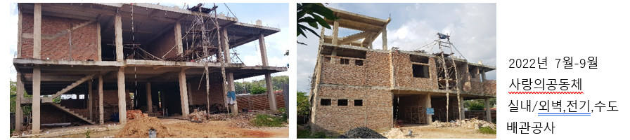 사랑의공동체 선교센터 착공 14개월 동안 공정률 40% 정도 완료된 상태입니다. 지난 7월 부터는 1층과 2층 내벽/외벽 공사와 함께 전기, 수도배관 공사 중에 있습니다. 사랑의공동체에 허락된 형편에 맞추어 시공업체와 단계적으로 건축/공사계약을 진행하고 있습니다. 공사가 더디게 진행되더라도 허락하신 형편에 감사함으로 건축사역을 감당하고, 헌당 될 수 있도록 기도합니다. 예수님의 사랑으로 생명을 돌보고, 믿음과 소망의 기쁨으로 예배하며 하나님 나라를 이루어가는 사랑의공동체 선교센터 건축과 사역의 동역자로서 기도와 사랑, 후원으로 함께 해 주셔서 감사합니다.