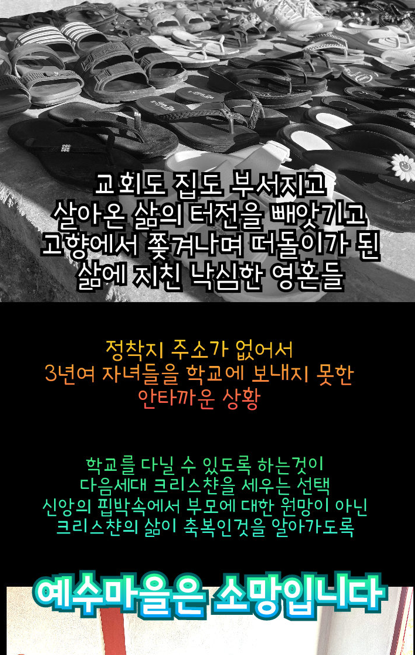 미얀마는 여전히 사회, 정치 모두가 혼란스럽습니다. 이러한 가운데 신앙으로 인해 삶의 터전을 빼앗기고 난민이 된 가정들이 모여 예수 마을을 건축하고 있습니다. 매일 함께 모여 식사를 나누고 또 함께 예배하며 절박한 상황에서도 도리어 하나님을 찬양합니다.