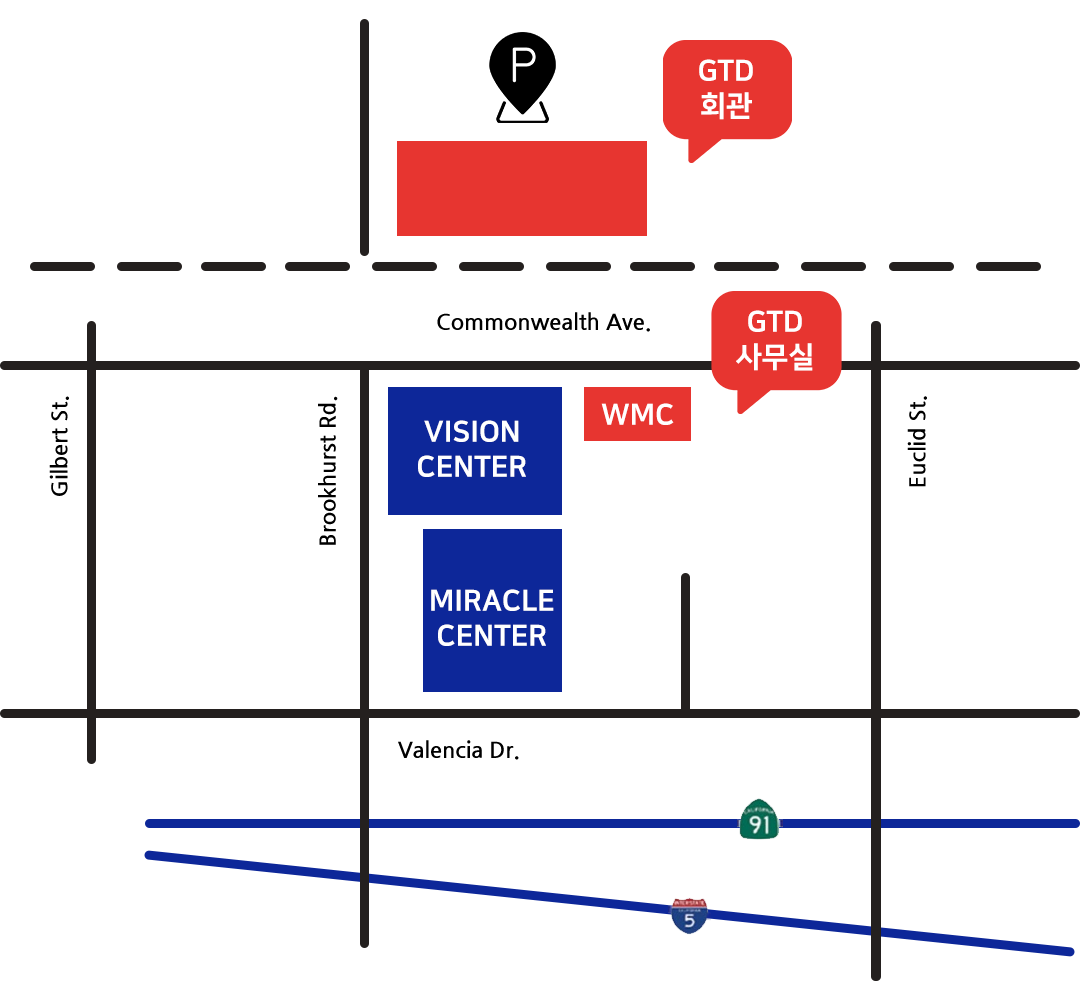 GTD 회관Brookhurst에 위치한 은혜한인교회 비전센터 commonwealth 길 건너편 깃찻길쪽에 위치하고 있습니다.